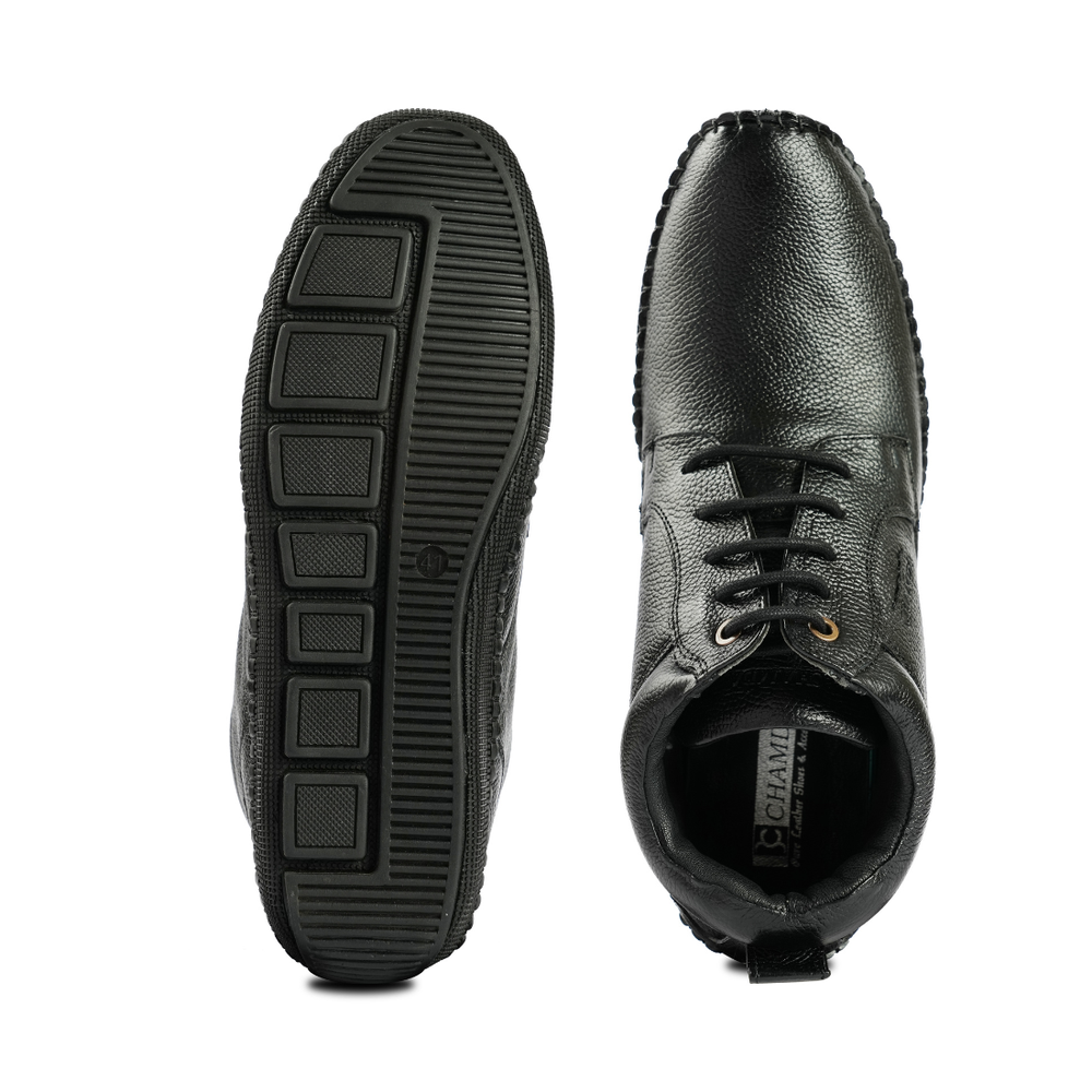 Chamda black lace-up casual shoes are designed with a textured genuine leather upper and a sturdy rubber sole for enhanced grip and comfort. The versatile design blends everyday style with durability, making these shoes ideal for daily wear, travel, and casual outings.