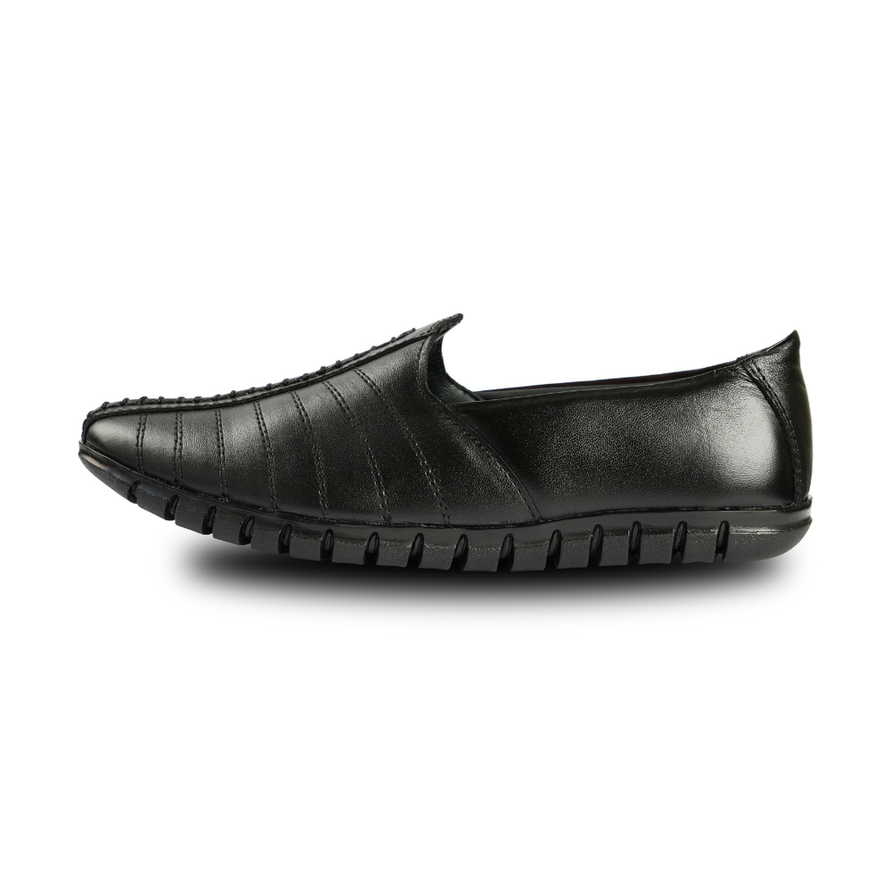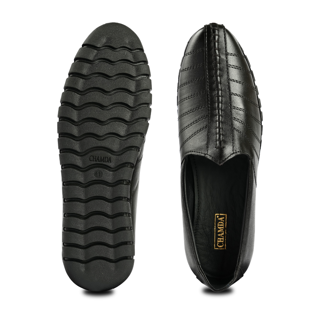 Chamda black slip-on casual shoes are crafted with a smooth leather upper and stitched detailing for a clean, modern look. The flexible sole and cushioned interior provide all-day comfort, making them ideal for everyday wear with casual and semi-casual outfits.