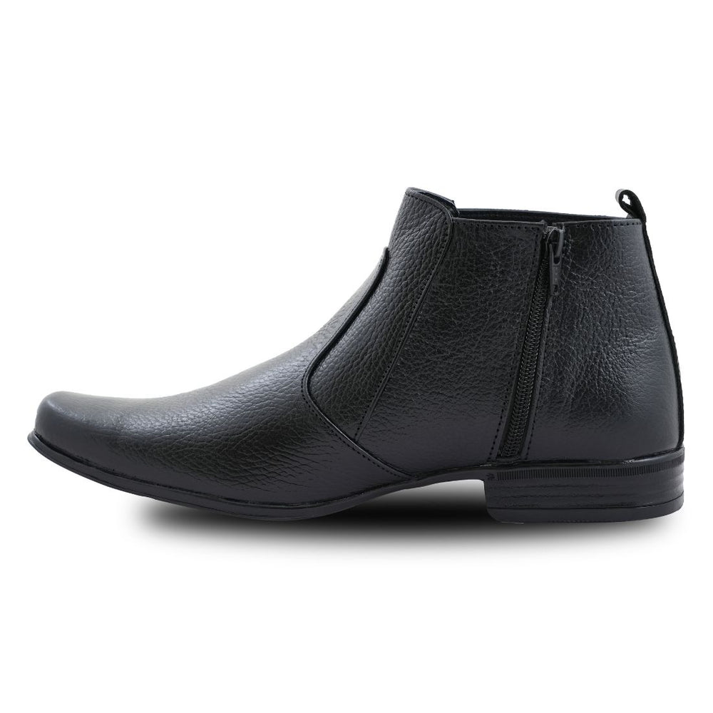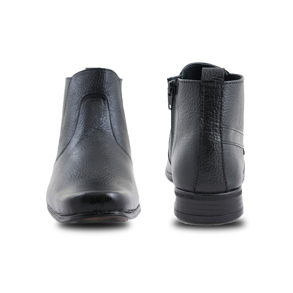 Chamda Men's Black Genuine Leather Ankle Boots with Side Zip Crafted from premium genuine leather, these ankle boots deliver sophisticated style with practical functionality. The side zip closure ensures effortless on-and-off convenience without compromising the sleek silhouette. Designed for the discerning man, the black colorway pairs seamlessly with both casual and formal wardrobes. The ankle-height cut provides versatile styling options, while quality leather construction promises durability and a refined appearance that improves with age. An essential investment piece for any modern gentleman's footwear collection.