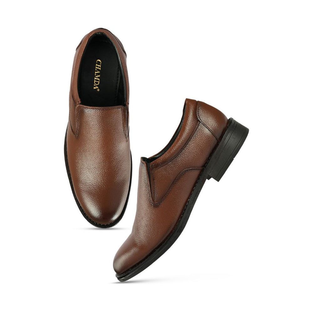 Chamda Men's Brown Formal Leather Slip-On Loafers combine timeless elegance with everyday practicality. Crafted from premium brown leather, these loafers feature a refined slip-on design that eliminates lacing while maintaining a polished appearance suitable for office settings, formal events, or business casual occasions. The cushioned insole provides all-day comfort, while the durable sole ensures longevity. A versatile staple that transitions seamlessly from professional environments to evening wear, these loafers deliver sophisticated style without compromise.